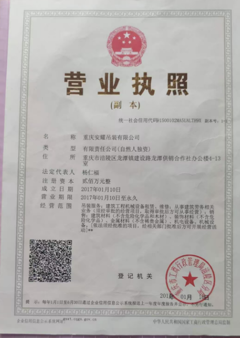 重庆安耀吊装有限公司营业执照